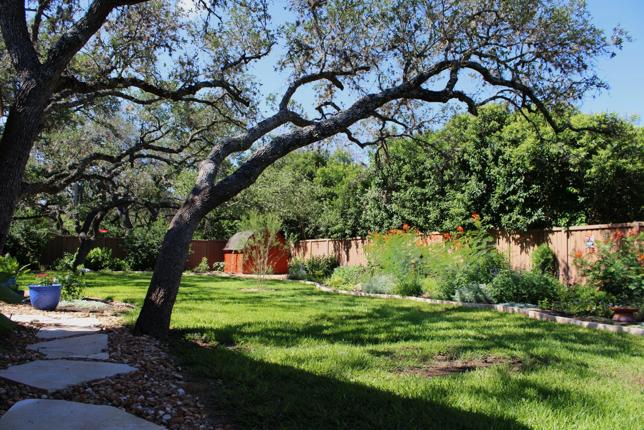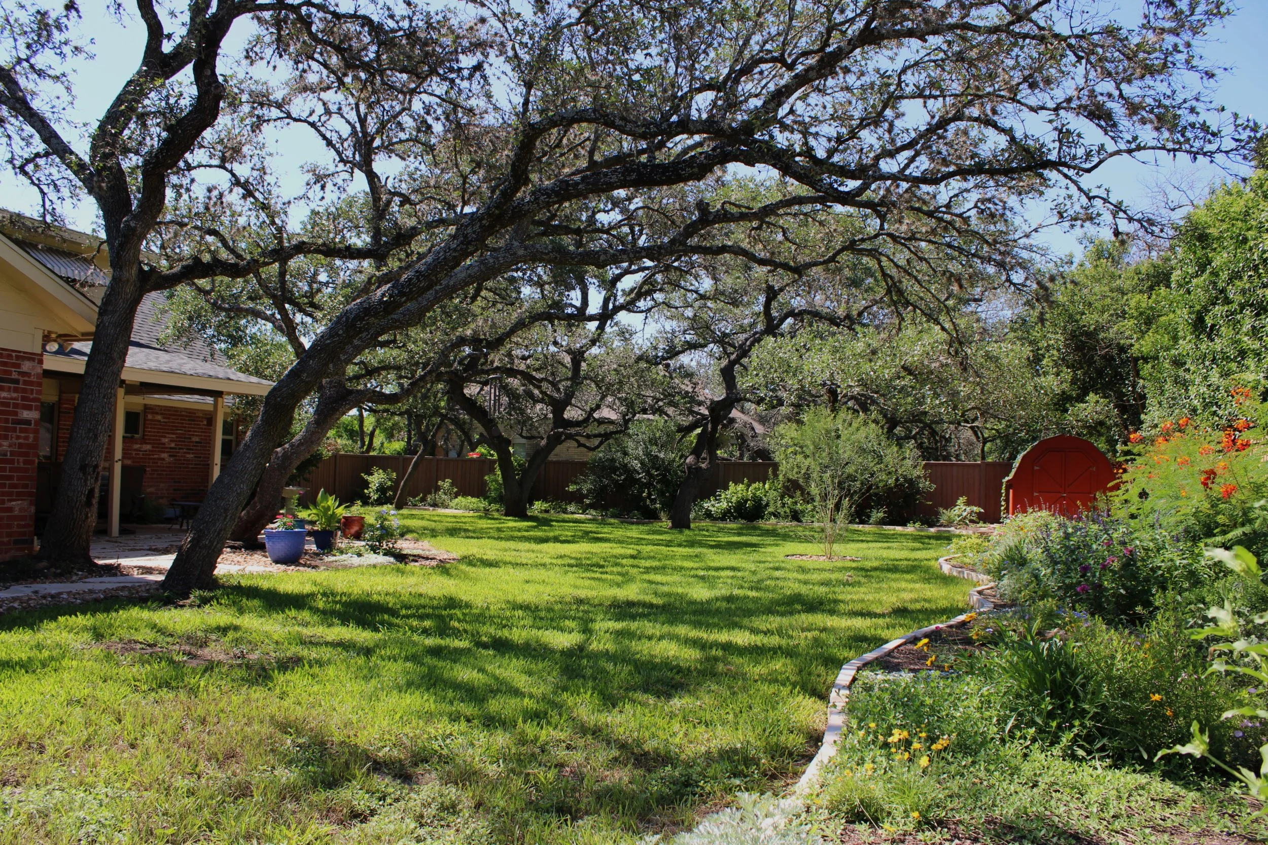 This parklike, expansive garden is comprised entirely of native and adapted plants. Focal and dramatic vantage points help ground the large space, gradually carrying the eye across the property. Large, defined beds reduce the lawn and allow for easier maintenance.